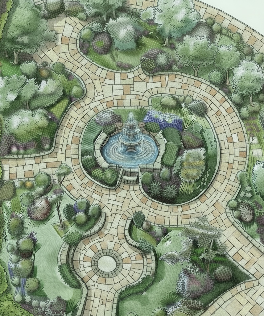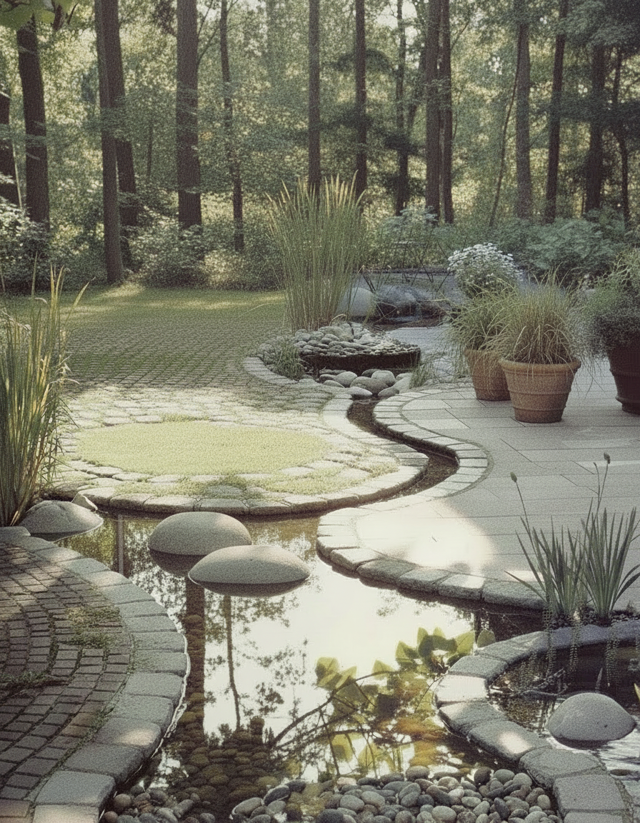 En sti som svinger. Et vannspeil som fanger lyset. Et nytt rom åpner seg bak neste. Små uterom som gir variasjon og rytme, sitteplasser som inviterer til å bli