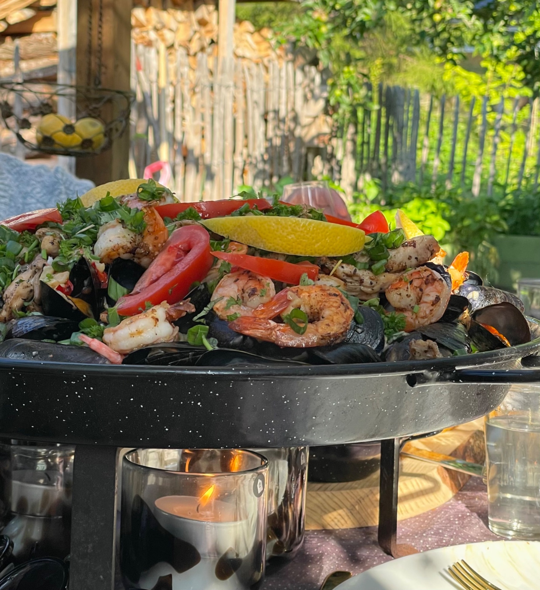 Skalldyrspasta laget på utekjøkkenet med deilige urter og grønnskaker i fra kjøkkenhagen. Langbord under epletreet, lykter under trekronen, og gode venner.